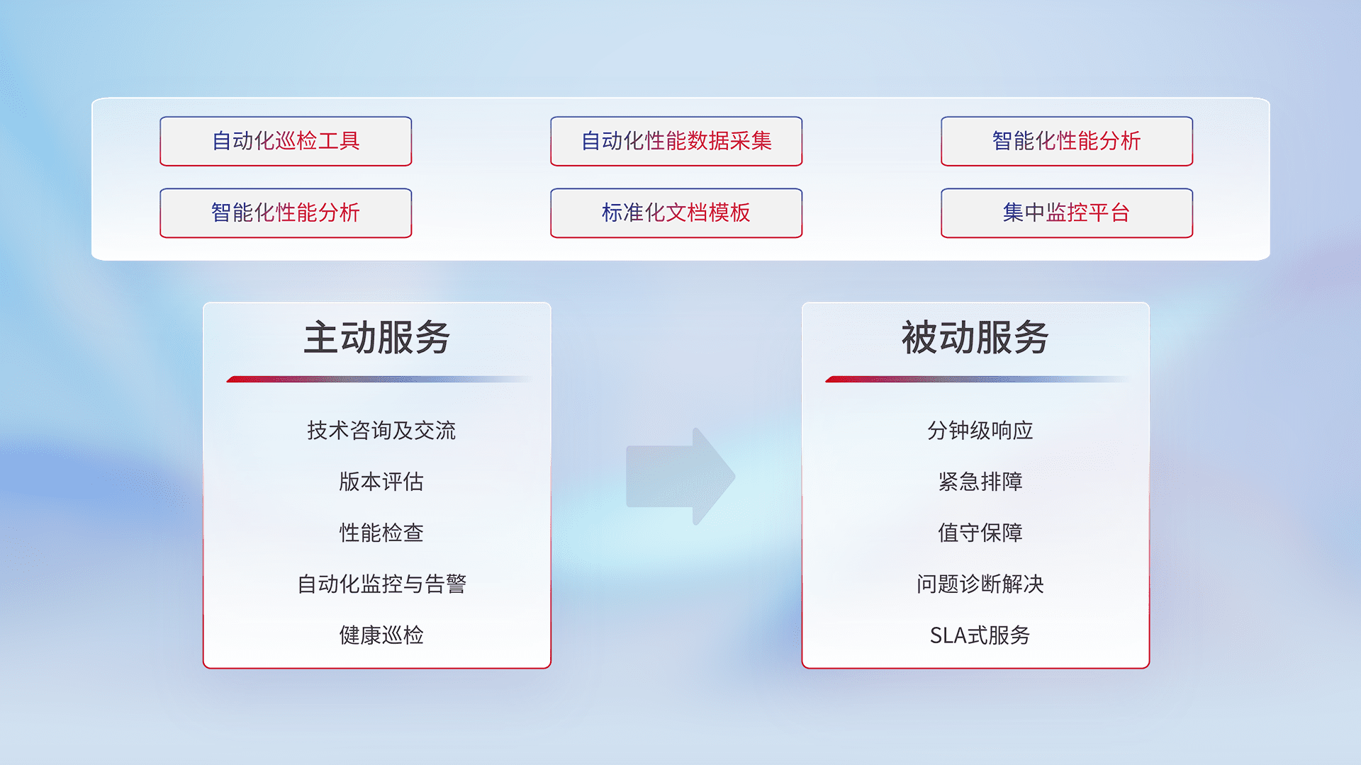 智能化工具和标准化文档,,,,保障服务质量,,提供主动服务(包含技术咨询、、、、版本评估、、性能检查、、、自动化监控与告警、、、健康巡检)和被动服务包含(分钟级响应、、、紧急排障、、值守保障、、、问题诊断解决、、SLA服务)。。。